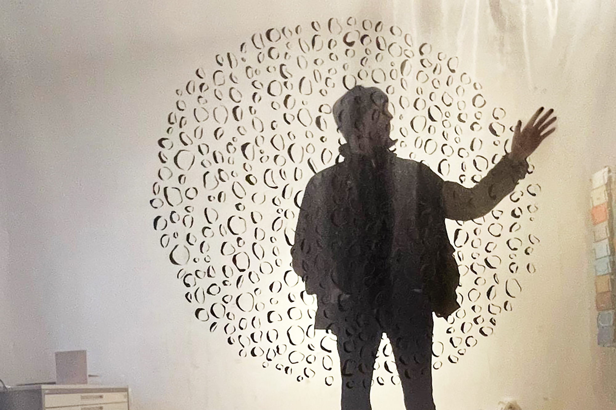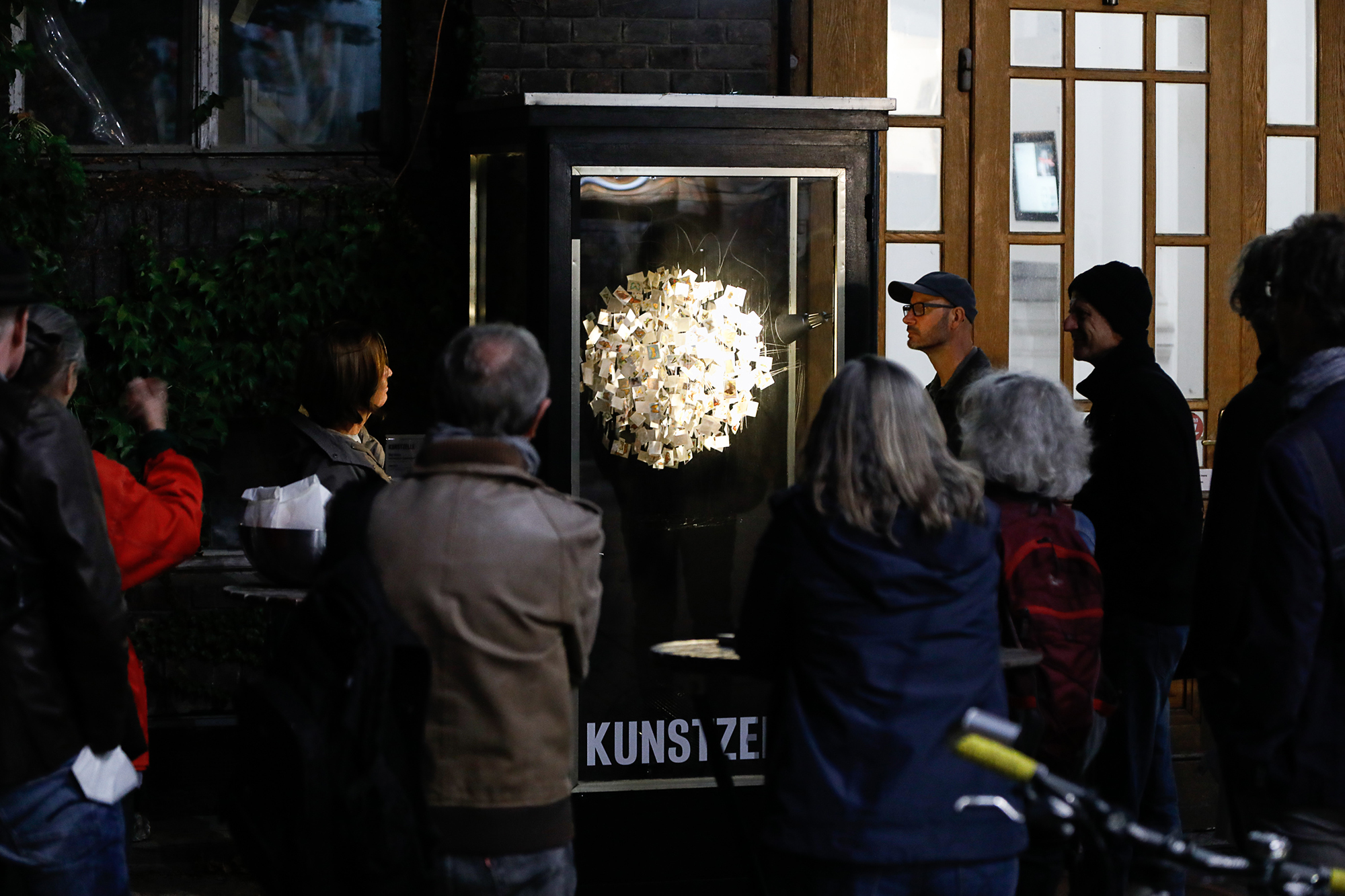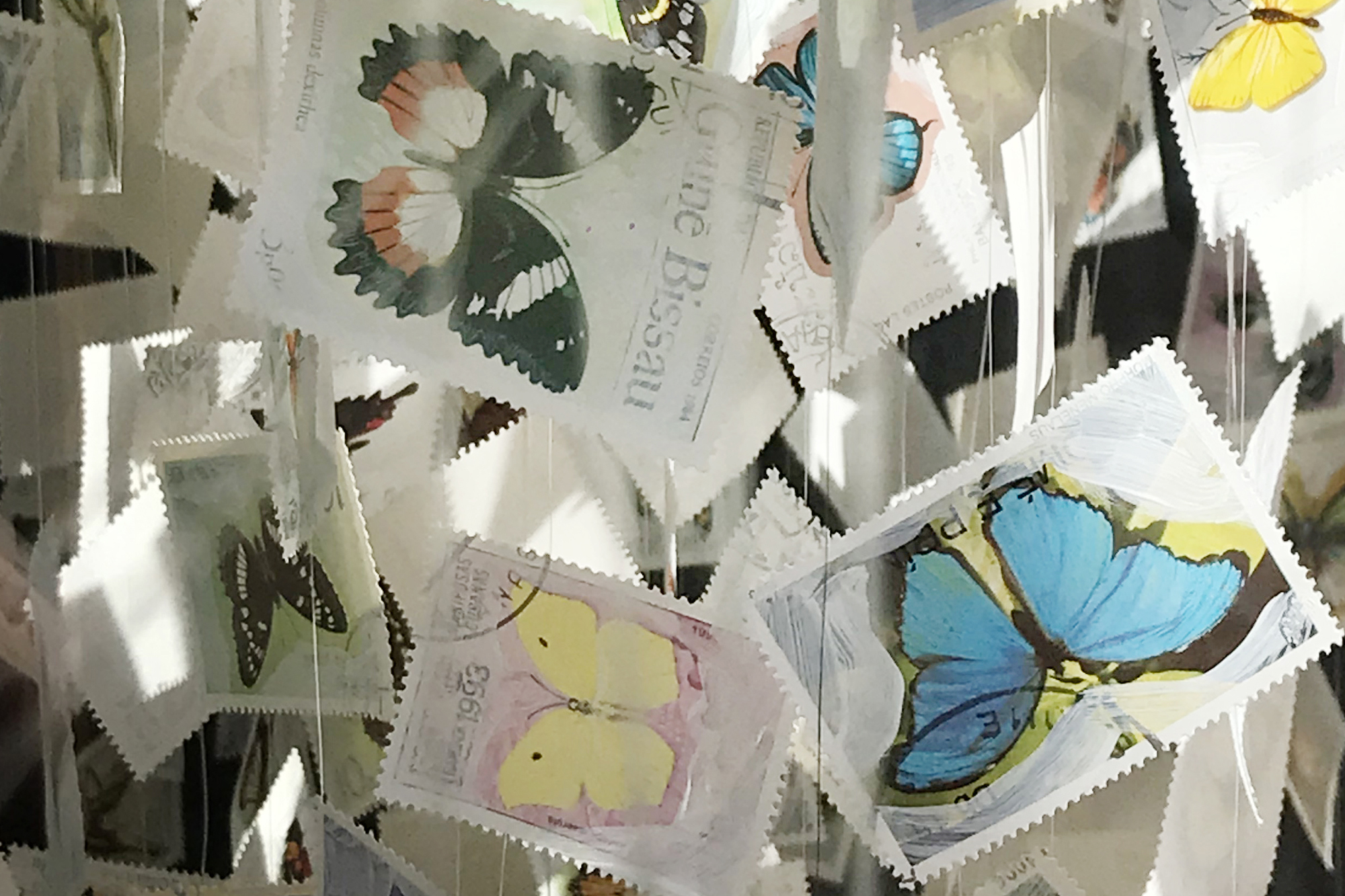 Übermalte Briefmarken, Nylonfaden, Draht, Kapa-Platte, Ventilator